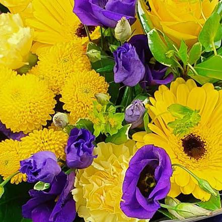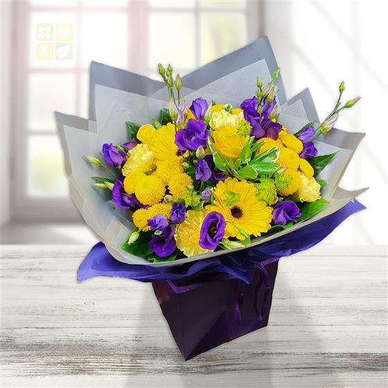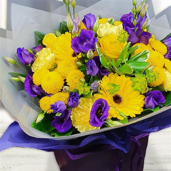A vibrant hand-tied bouquet combining yellow gerberas, yellow roses, button chrysanthemums, purple lisianthus and soft green foliage, creating a bold, uplifting mix with strong colour contrast and a fresh, modern finish.
