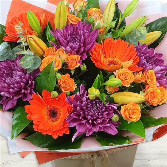Design includes vibrant orange gerbera, rich purple chrysanthemums, clusters of orange spray roses, eucalyptus sprigs and glossy green foliage, arranged into a bold, energetic bouquet with punchy colour contrast and layered texture.