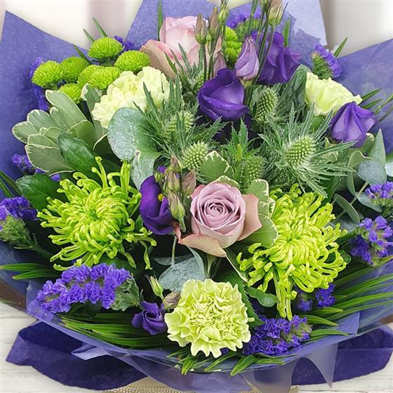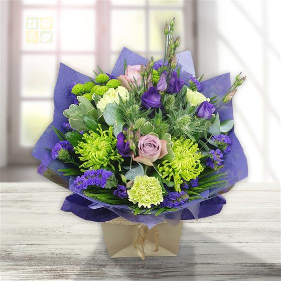 Enchanting bouquet featuring lavender roses, chrysanthemums, delicate purple lisianthus, violet statice, silver eryngium and eucalyptus, beautifully accented with lush greenery and elegant wrap, opulent presentation.