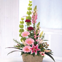 Front facing arrangement including seasonal snapdragons, scented lilies, and pretty gerbera, professionally arranged by us in a basket ideal for placing on a sideboard.