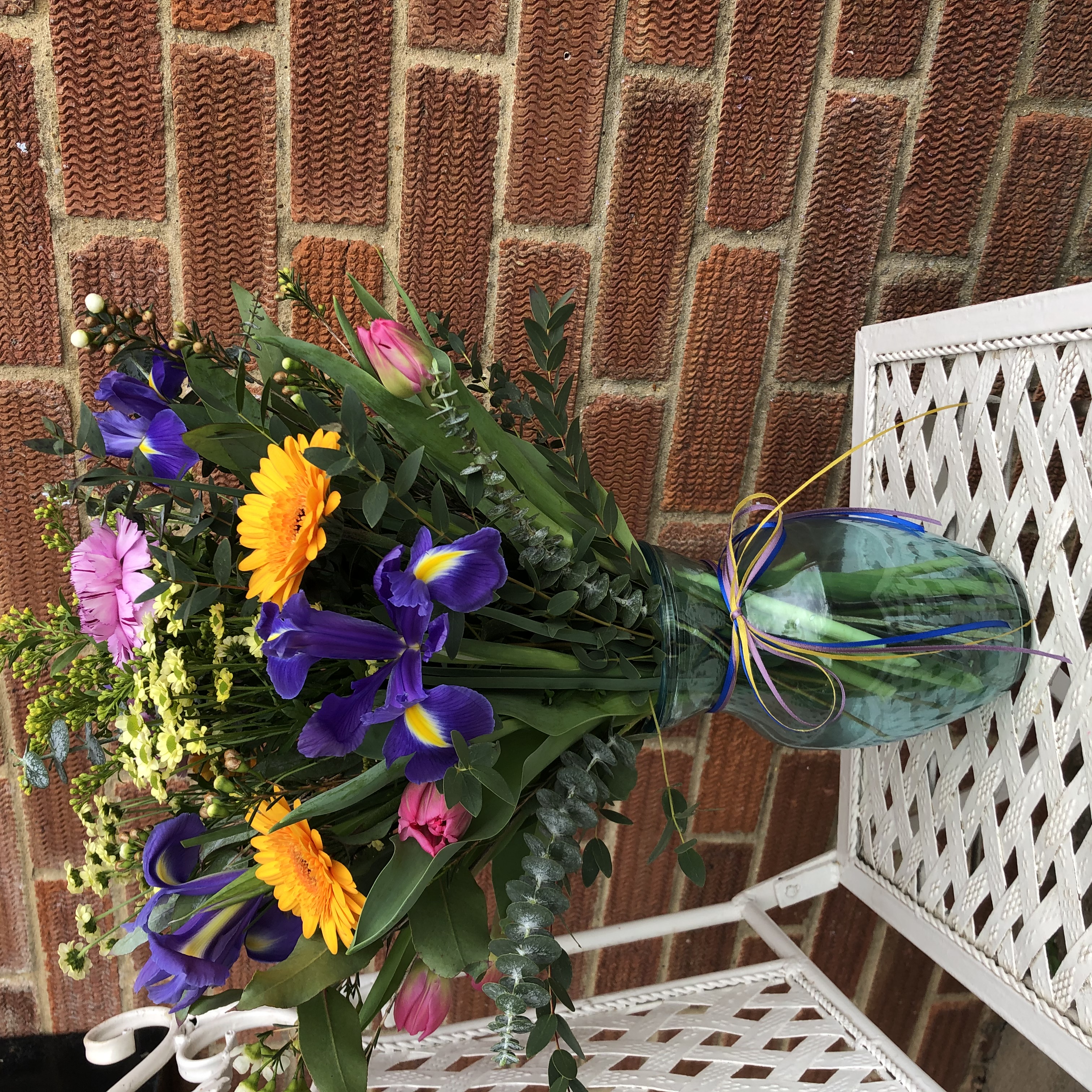 Selection of seasonal flowers in fresh spring colours. Easy to maintain design as the flowers are arranged in foam and just require watering occasionally.